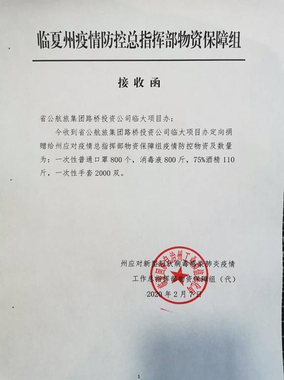 一方有難八方支援,2月7日下午,臨大項目辦黨支部書記帶領項目辦黨員代表,為臨夏州應對新型冠狀病毒感染肺炎疫情工作總指揮部物資保障組送去了口罩、84消毒液、75%酒精、手套等防疫物資,此次捐贈活動充分發(fā)揮公航旅集團及路橋投資公司作為省屬國有企業(yè)在防控疫情方面的重要作用,臨大項目辦黨支部千方百計,克服種種困難,盡最大努力在克服自身防疫物資緊張等實際困難情況下,積極主動向臨夏州捐贈這批防疫物資,加強與當地衛(wèi)健委、防疫應急管理等政府職能部門的聯動聯守、信息共享,為打贏疫情防控阻擊戰(zhàn)作出應有貢獻。